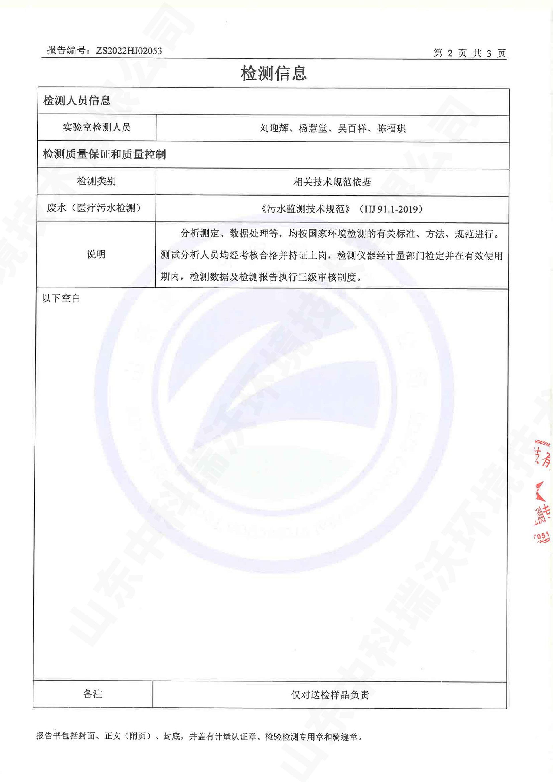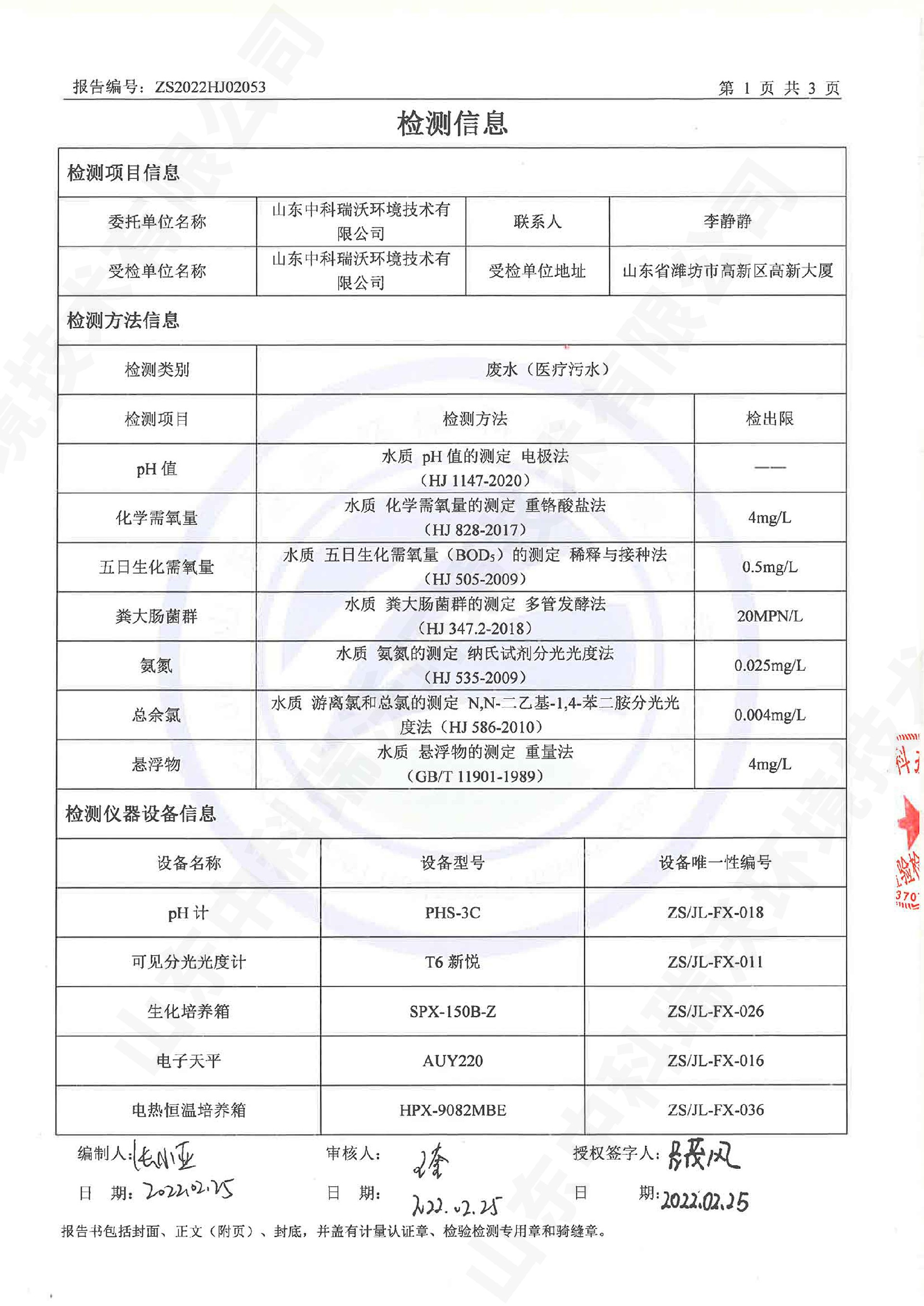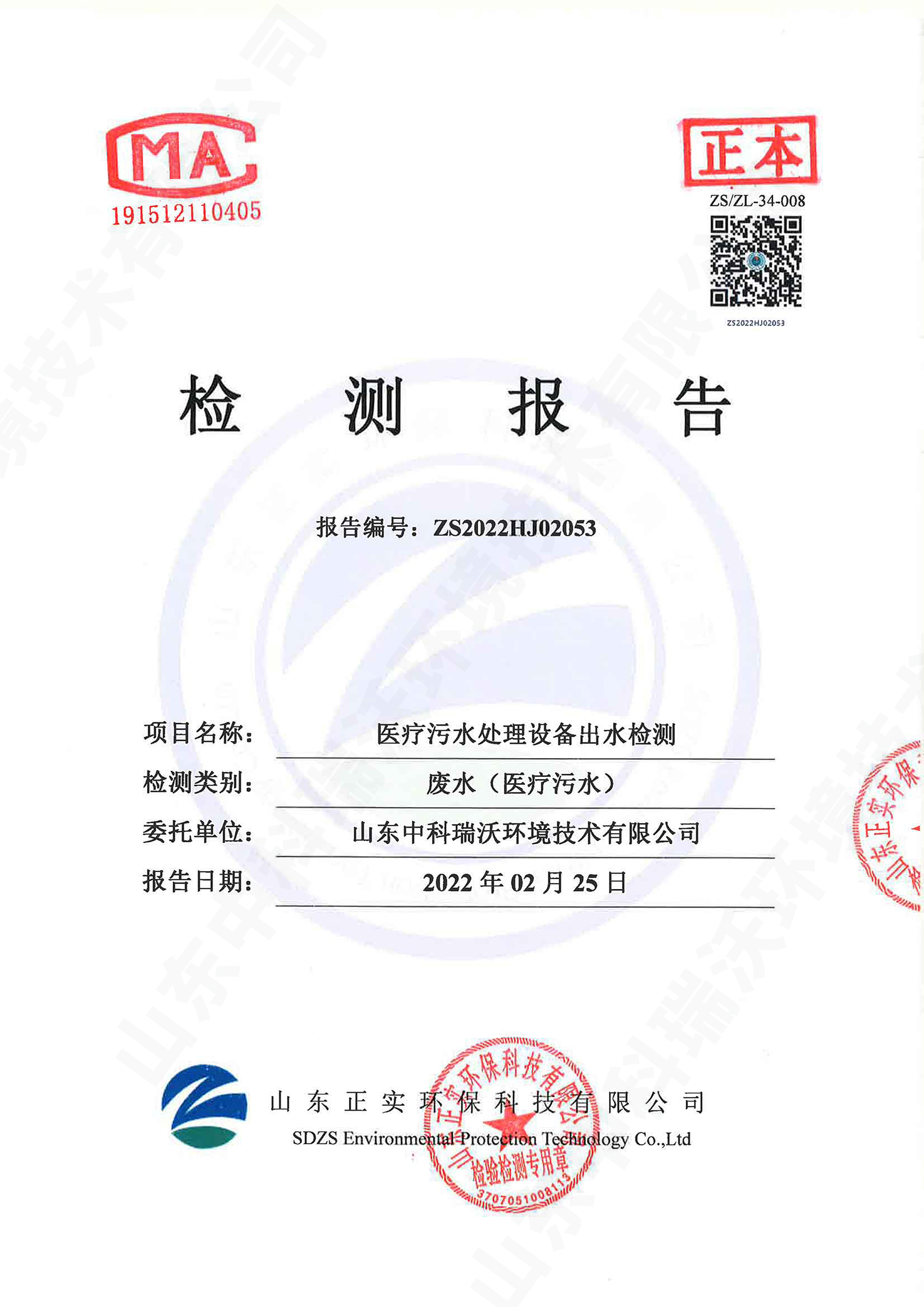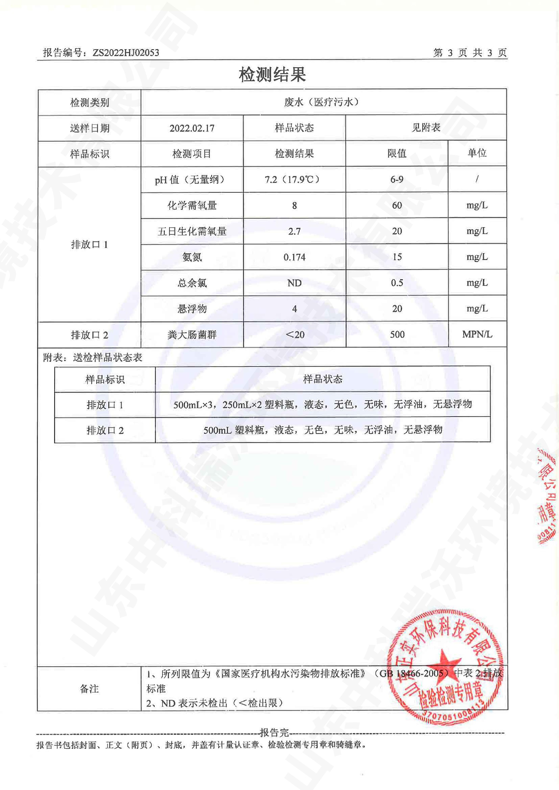 醫療汙水處理設備出水檢測報告