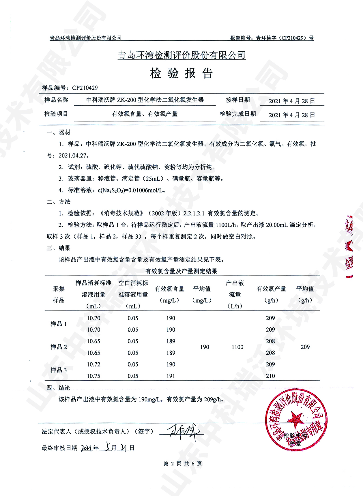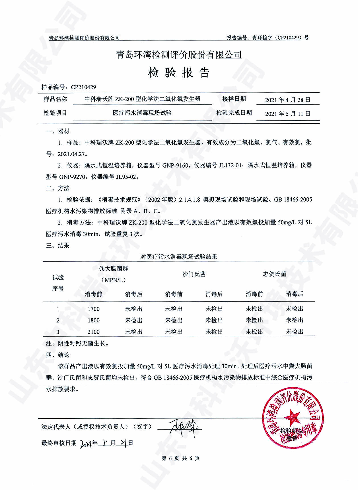 醫療汙水處理設備檢測報告~二氧化氯消毒