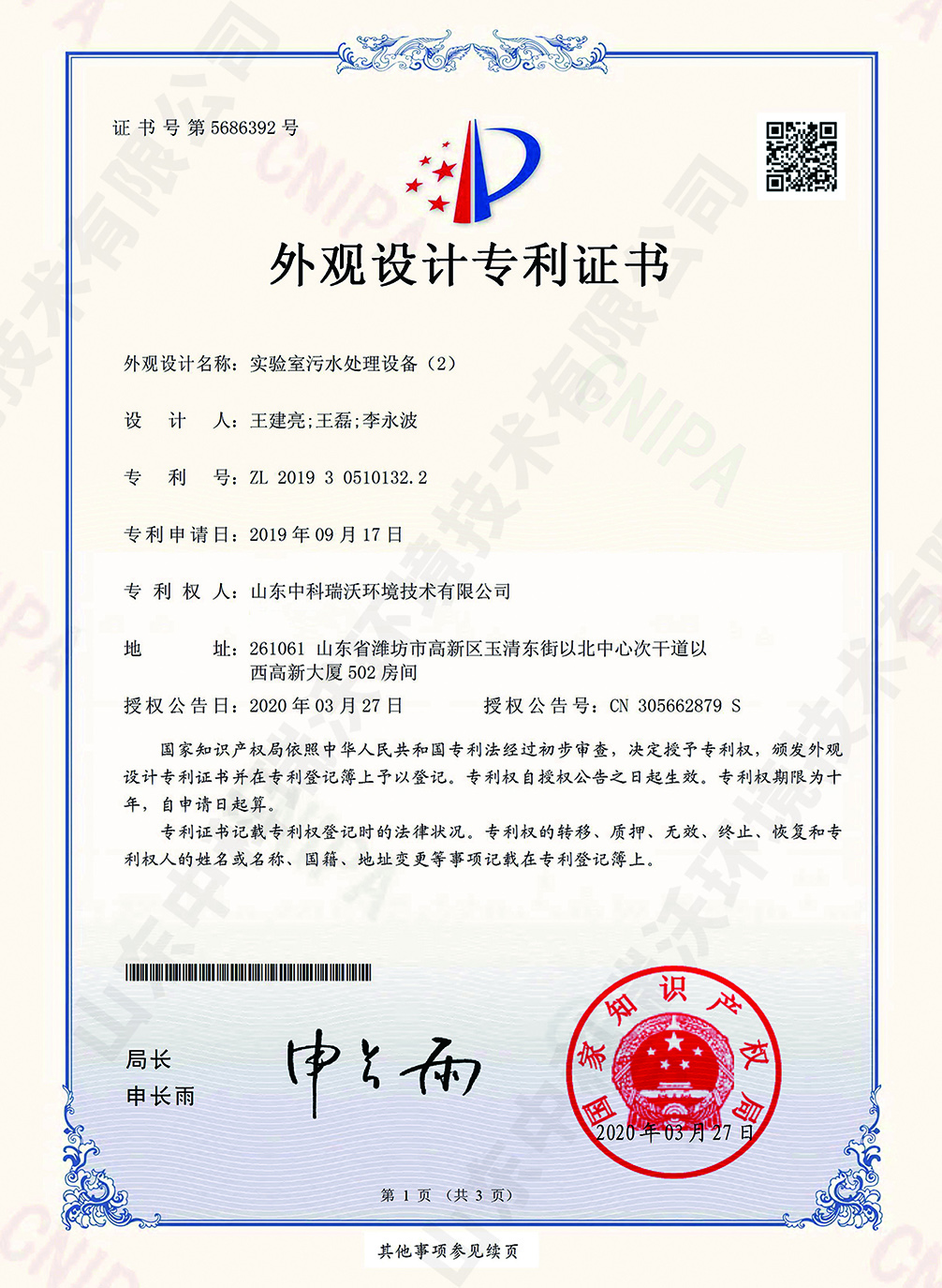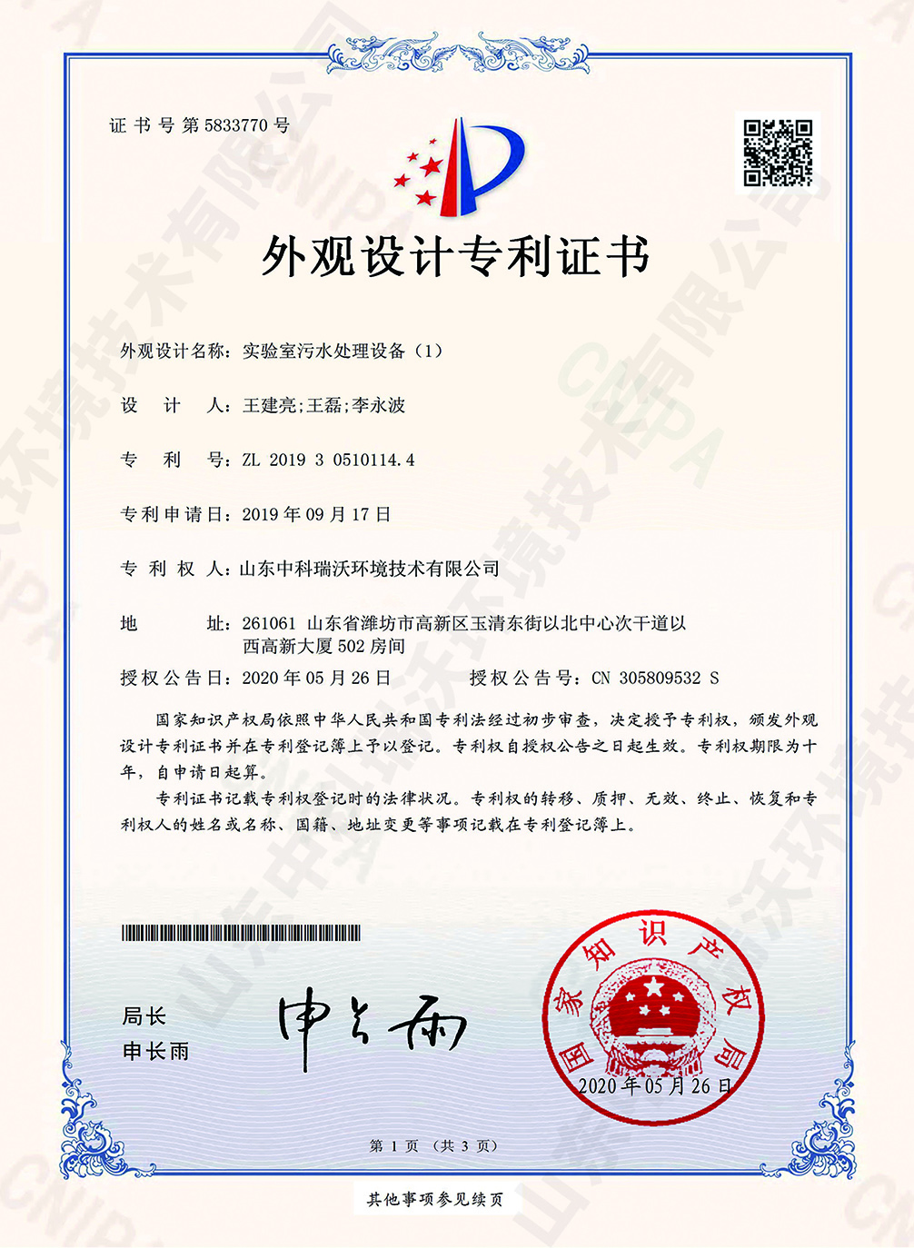 全自動中水回用設備~專利證書